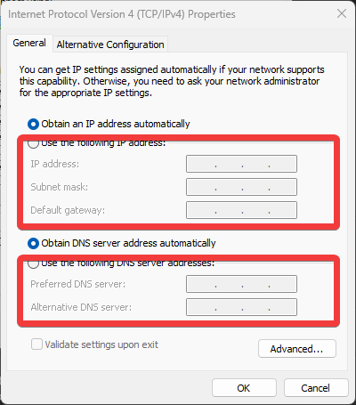 - Choose the Use the following IP address or Use the following DNS server addresses, and enter the values you want to use.