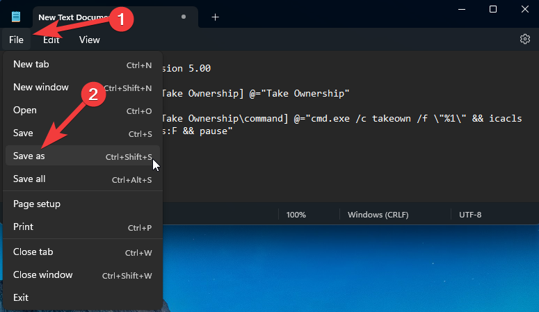 - Click the File menu, choose Save as, then choose a relevant name for the file and add a .reg extension, such as take_ownership.reg.