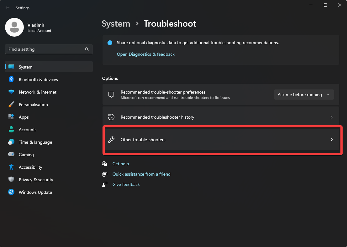 3. Click the Other Troubleshooters button.