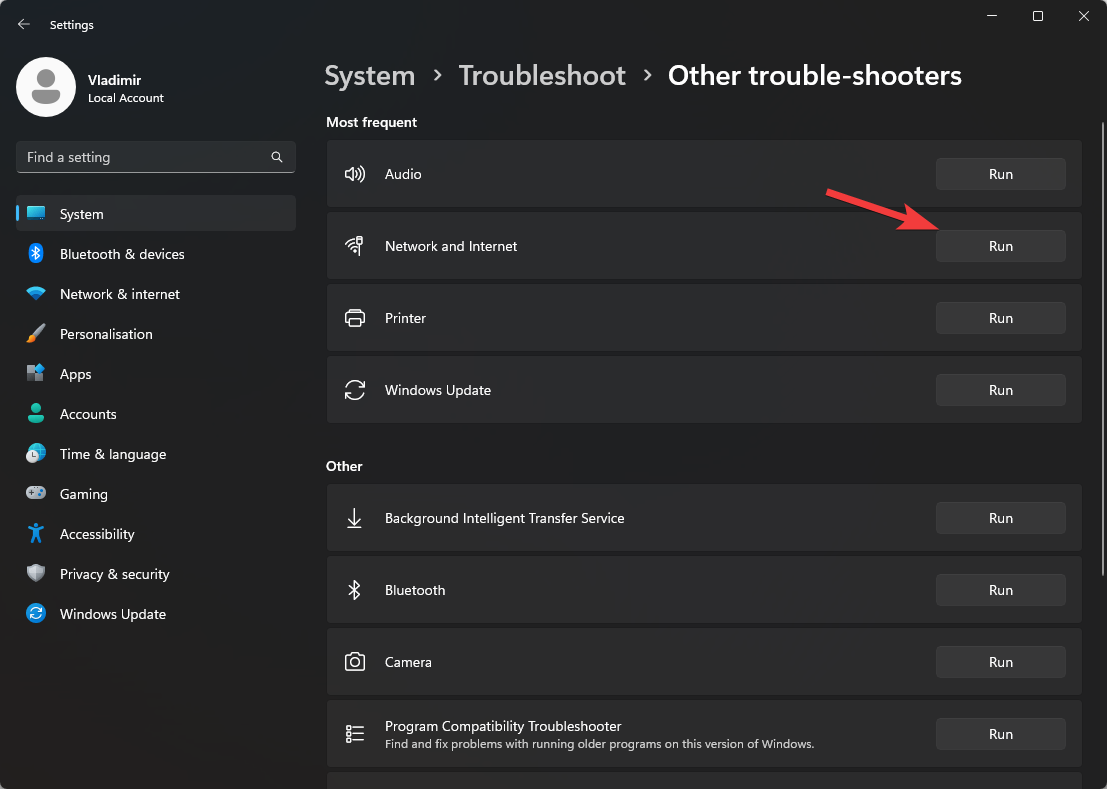 4. Run the Network and Internet troubleshooter by clicking the Run button.