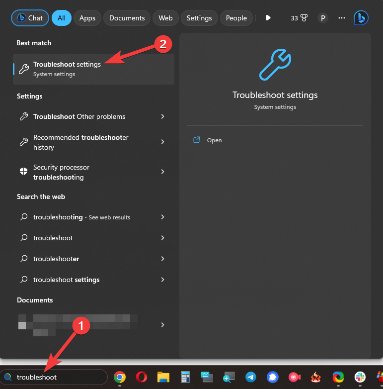 1. Click the Start button and type troubleshoot in the search field.