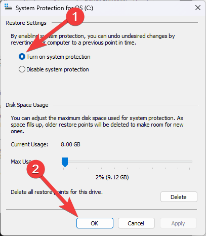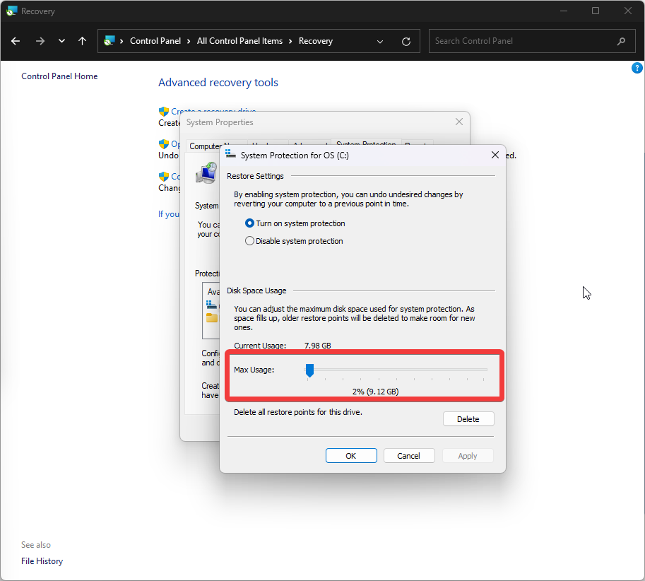 4. Adjust the maximum disk space allocated for system protection to ensure enough space for shadow copies.