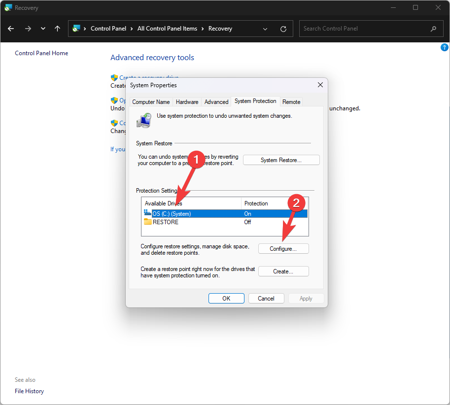 4. Click the Configure button, ensure that the Turn on system protection option is selected, and click OK.