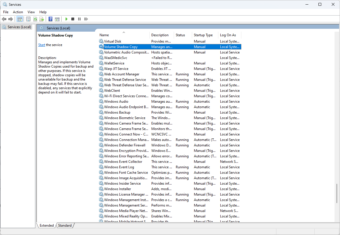 4. Find the Volume Shadow Copy service, right-click it, and choose Restart.
