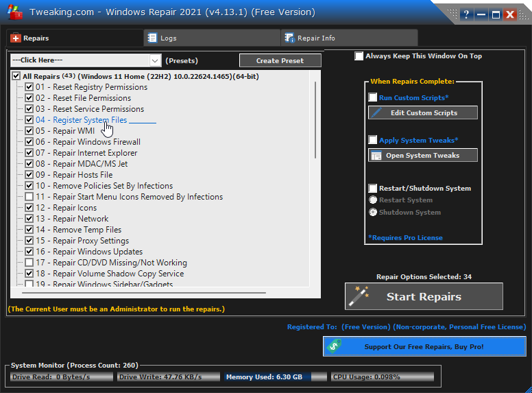 - Repair Registry Permissions – fixes registry permissions problems that could be the source of errors or crashes.