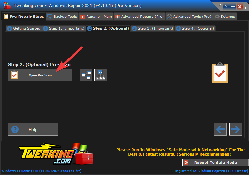 - In Step 2, you can choose the Open Pre-Scan button to allow the software to check your system for errors.