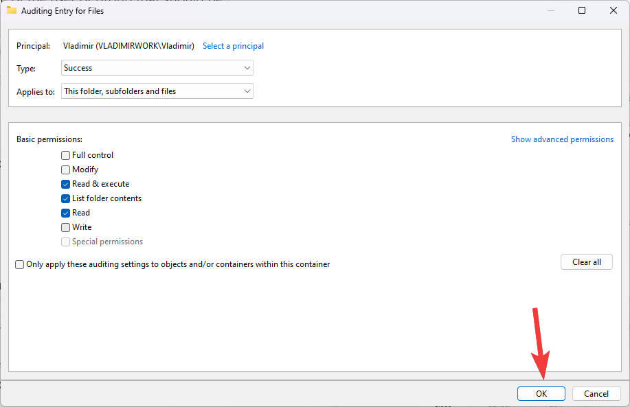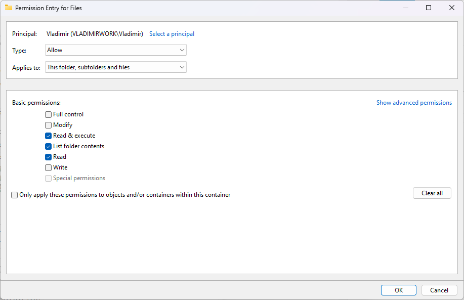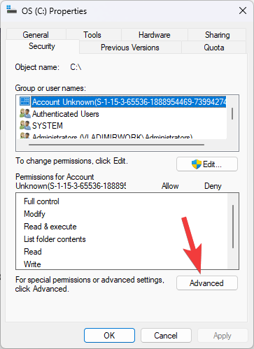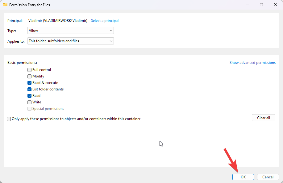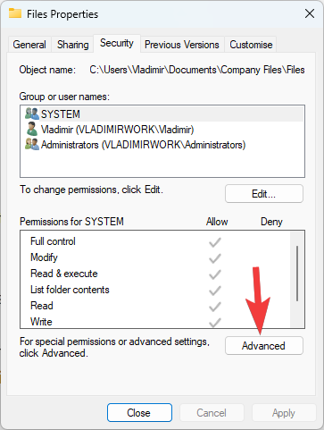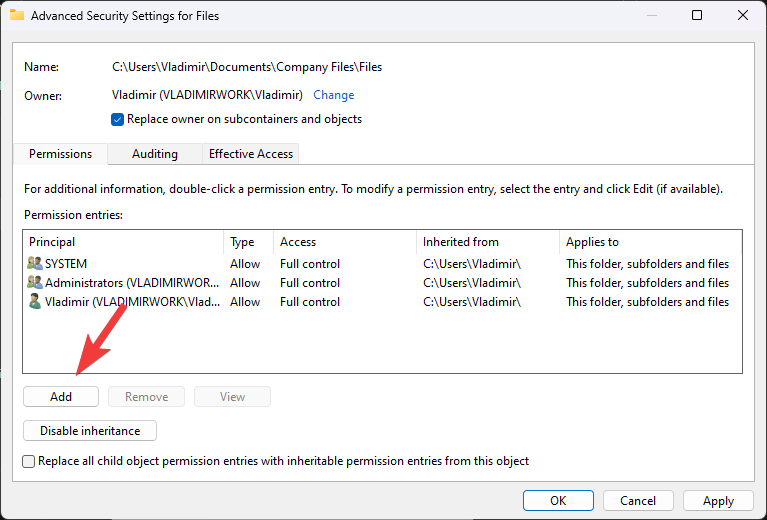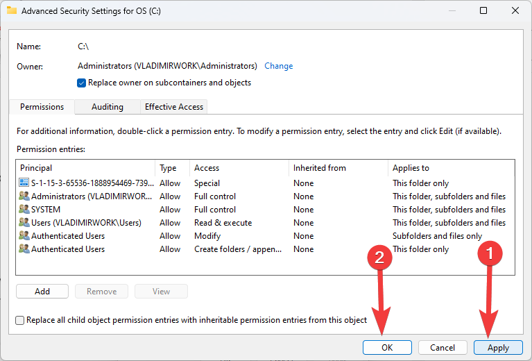 - Click Apply and then OK to close the Advanced Security Settings window.