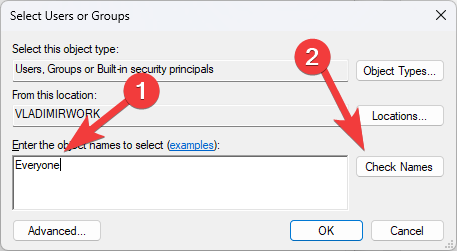 - In the Select Users or Groups window, type Everyone in the object name field and click Check Names. This will verify that the name is correct and underline it.