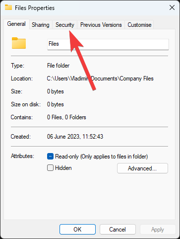 - In the Properties window, click on the Security tab.
