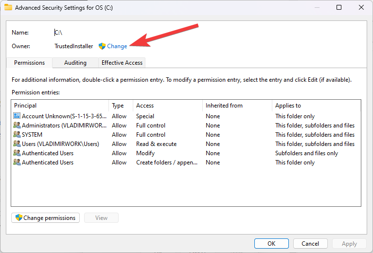 - In the Advanced Security Settings window, click on the Change link next to the Owner field.