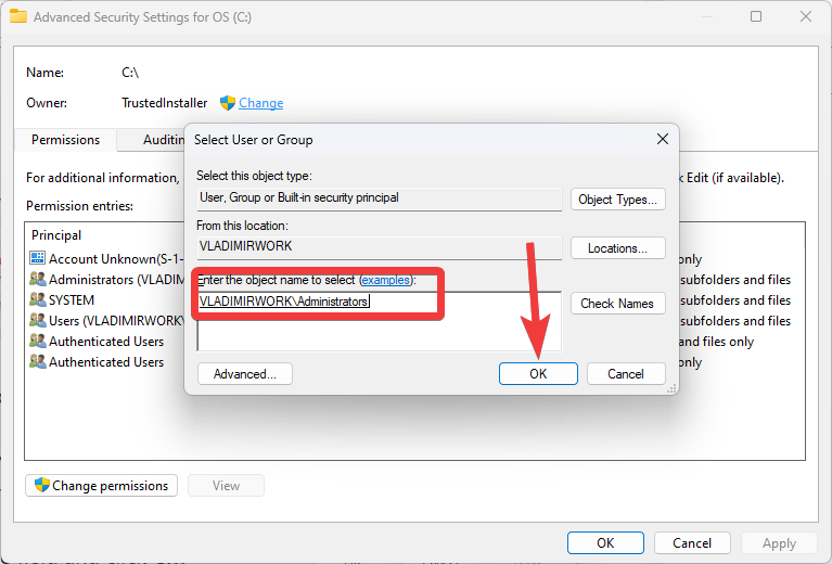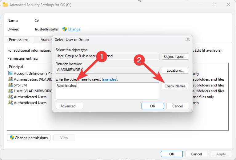 - In the Select User or Group window, type Administrators in the object name field and click Check Names. This will verify that the name is correct and underline it.