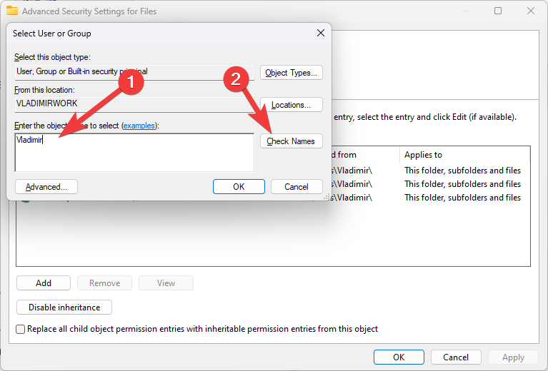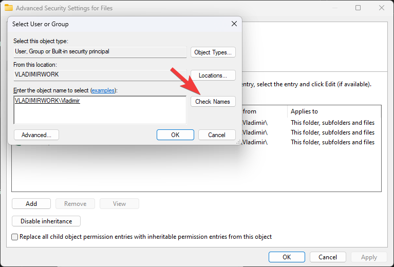 - Write the name of the user or group, and click Check Names, and click OK.