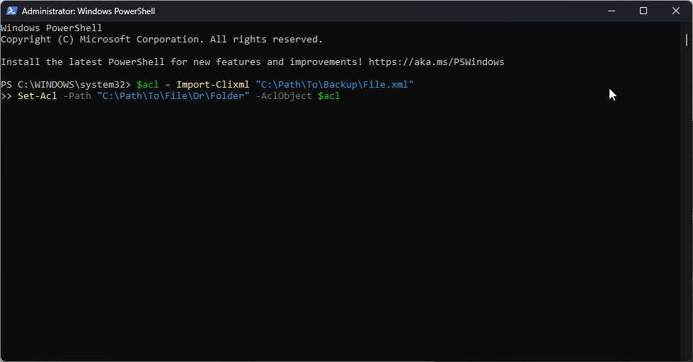 Replace “C:\Path\To\Backup\File.xml” with the path and name of the backup file you want to restore from, and “C:\Path\To\File\Or\Folder” with the path of the file or folder you want to restore the permissions to.