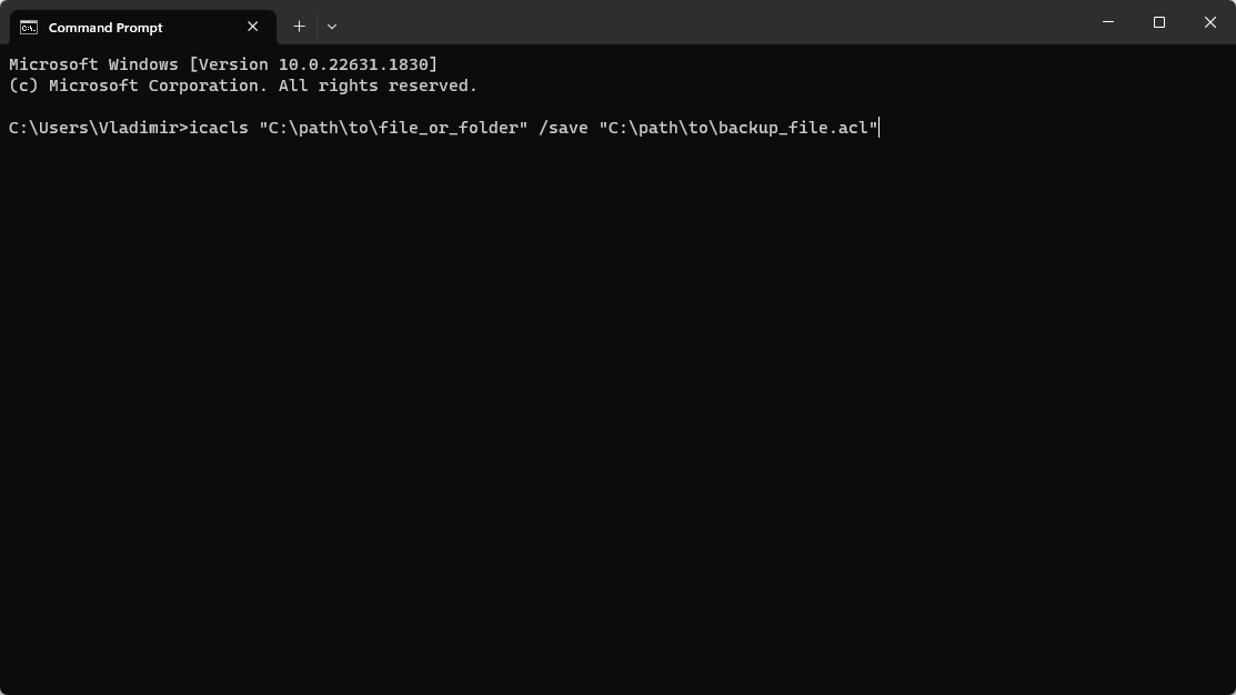 - Type icacls followed by the folder or file path you want to backup permissions for.