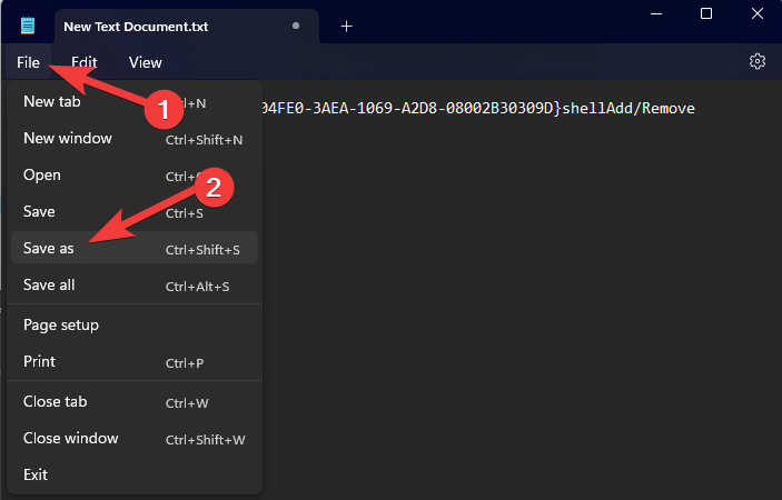 - Save the text file by using the Save as menu, with a name of your choosing but add .reg to change the format.