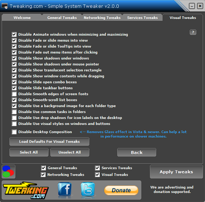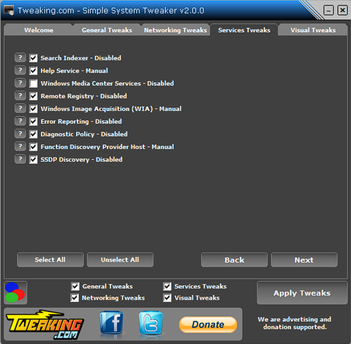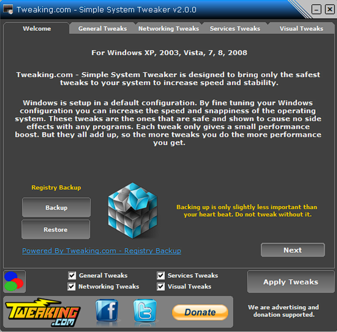 Tweaking.com – Simple System Tweaker is designed to bring only the safest tweaks to your system to increase speed and stability.