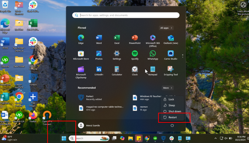 • Go to the Start menu > Power icon > Restart.