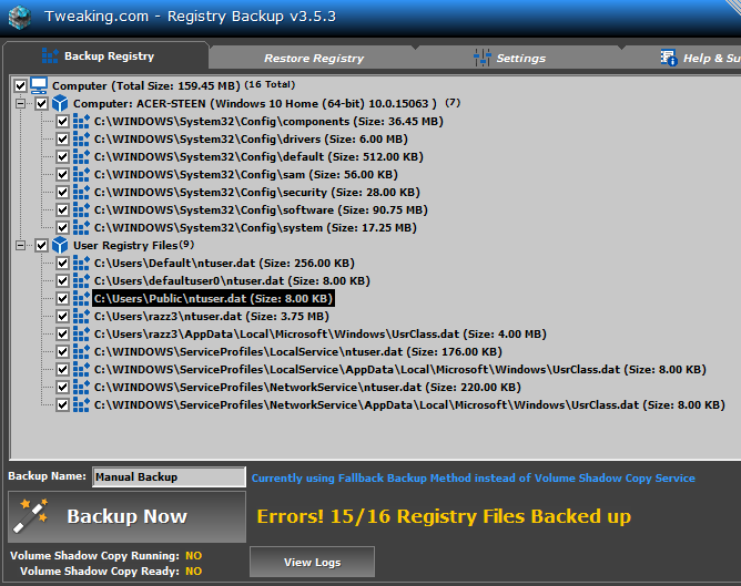 After backup upon startup today, Tweaking.com Registry Backup reported that 1 out of 16 registry backups failed. The error occurred on "C:\Users\Public\ntuser.dat (Size: 8.00 KB)
